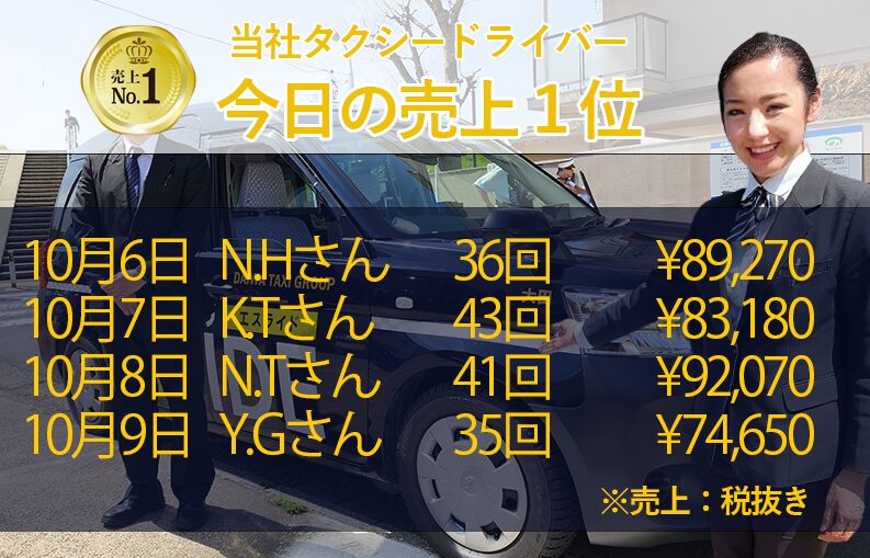 2025年10月6日~10月9日 売上トップタクシードライバー2025-10-12T12:03:22+09:00