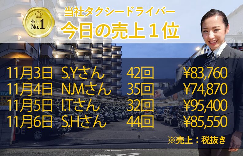 2025年11月3日~6日 売上トップタクシードライバー 2025-11-10T09:05:03+09:00 2025年11月3日~6日 売上トップタクシードライバー2025-11-10T09:05:03+09:00