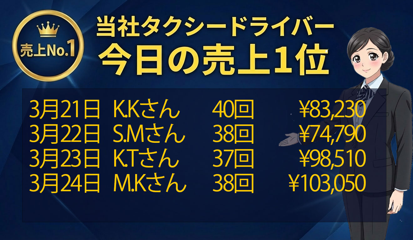 2026年3月21日~24日 売上トップタクシードライバー 2026-03-25T22:37:37+09:00 2026年3月21日~24日 売上トップタクシードライバー2026-03-25T22:37:37+09:00